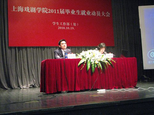 2010年10月19日下午,我校2011届毕业生就业动员大会在端钧剧场举行,各院系领导、辅导员、班主任、全体班主任参加。动员会由院长助理王宏舟主持,上海市教委副秘书长汪歙萍亲临现场为毕业生开展就业指导讲座。