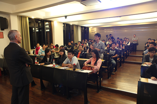 费尔•帕里(Phil Powrie)教授,是法国高校教授和领导人协会会员,1999年获法国政府授予的棕榈教育骑士勋章。当天晚上,209教室里座无虚席,同学们早早来到会场,费尔•帕里(Phil Powrie)教授进入教室,全场响起欢迎的掌声。