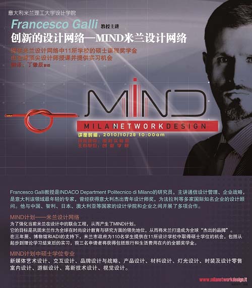 由创意学院主办的讲座《创新的设计网络-MIND米兰设计网络》将于10月28日上午10:00在虚拟实验室举行举行。主讲人Francesco Galli是意大利米兰理工大学设计学院教授,意大利INDACO Department Politecnico di Milano的研究员,主讲通信设计管理、企业战略,是意大利该领域最年轻的专家,曾经获得意大利杰出青年设计师奖,为法拉利等多家国际知名企业的设计顾问。他与中国、智利、日本、澳大利亚等国家的设计学院和企业之间开展了多项合作。届时欢迎广大师生参加!(供稿/创意学院 编辑/戎戎)