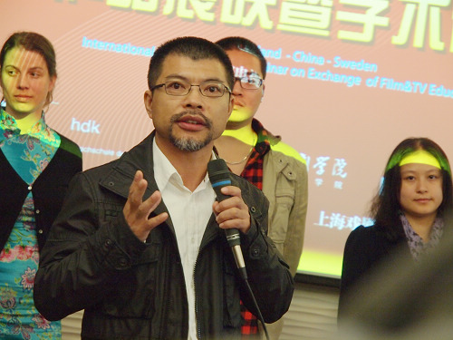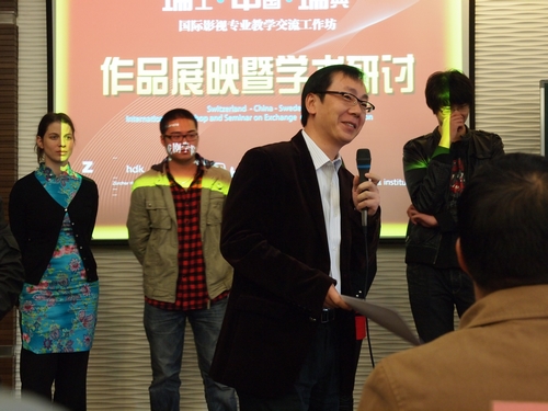 2010年11月3日下午一点半,一场别开生面的教学研讨会在上海戏剧学院举行。上海市教委高教处副处长傅建勤,上海电影频道总监、上海市广播电视学会秘书长、中国著名导演胡雪桦,上海戏剧学院副院长宫宝荣,教务处处长厉震林,电视编导系系主任方方,陪同瑞士驻上海领事馆有关官员和美国纪录片导演马可斯,召开了瑞士•中国•瑞典国际影视专业教学交流工作坊的作品展映暨学术研讨会。