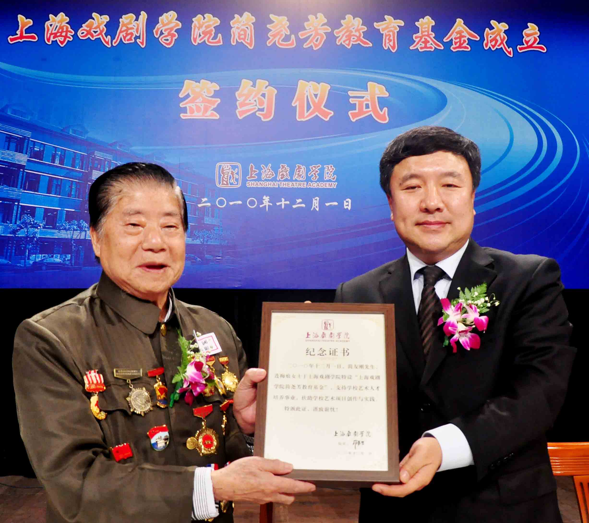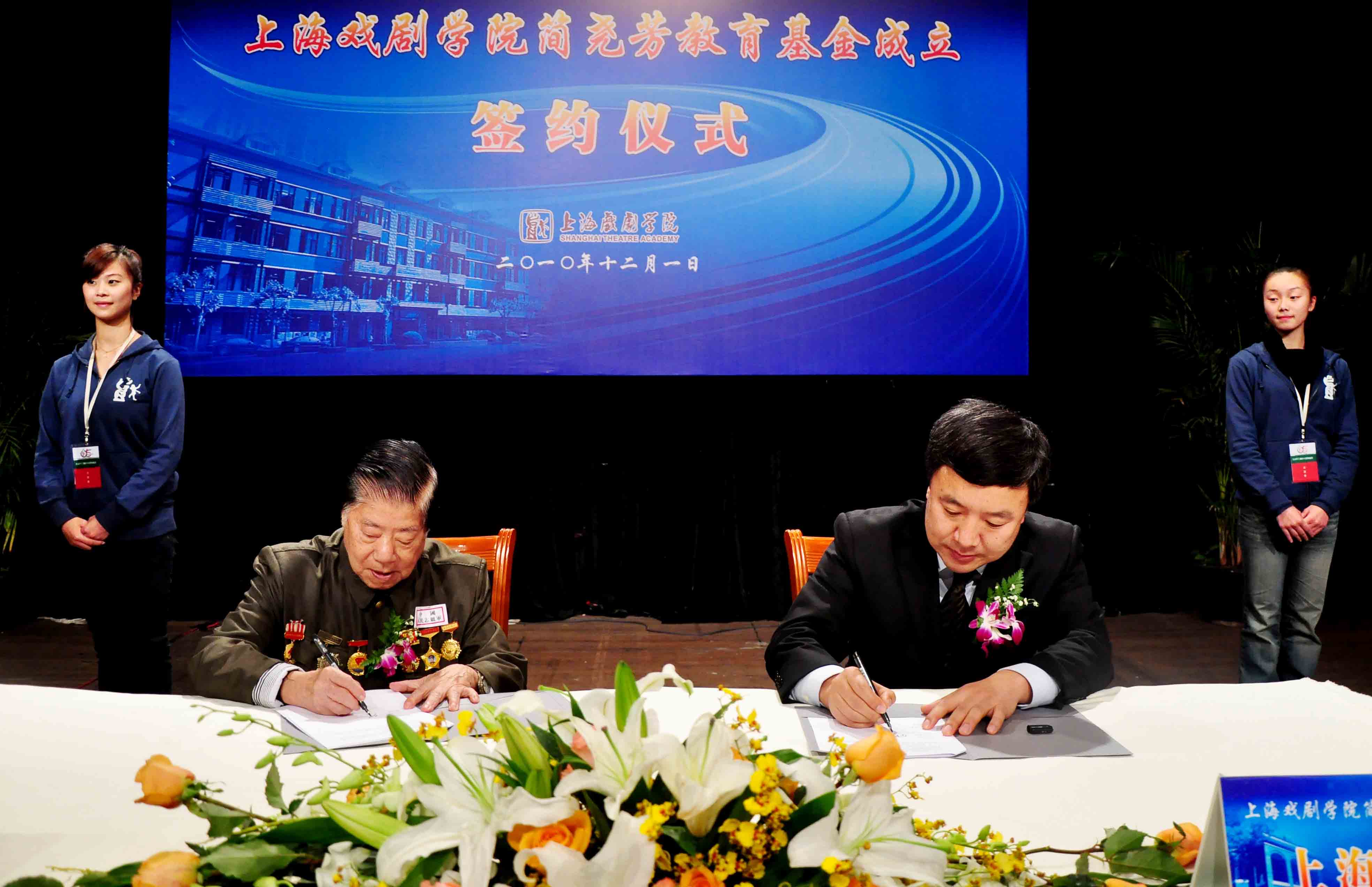 下午2点30分,上海戏剧学院简尧芳基金成立签约仪式在新空间剧场举行。简尧芳先生的儿子简友刚携妻校友连梅衡女士返校成立简尧芳基金会。基金会将连续四年每年支出100万元人民币支持上海戏剧学院的艺术教育事业。