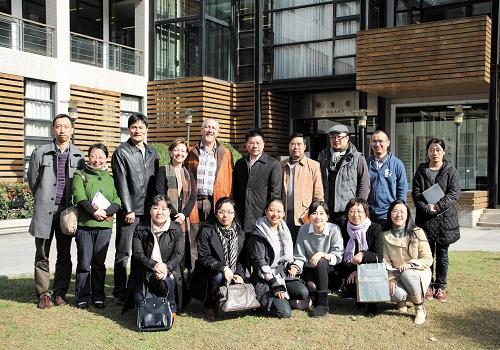 图为华特迪士来访嘉宾与创意学院老师在图书馆前合影留念