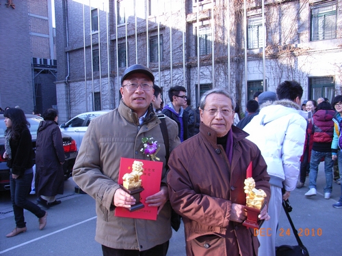2010年12月24日,由中国戏剧家协会主办的话剧“金狮奖”颁奖典礼在中央戏剧学院举行,我校戏文系支部书记吴小钧老师凭借《战神1948》获最佳编剧奖。《战神1948》系吴老师穷八年心血完成的剧作并由我校排演,演出获得各方好评。 此外,我校校友何念、周野芒、郭京飞、娄际成、王德顺、胡晓晖还获得了优秀导演奖、优秀表演奖、荣誉奖、经营管理奖、舞台美术奖等五项大奖。(文:东晓、戎戎 编辑:戎戎) 图为吴小钧老师与我校表演系校友、荣誉奖获得者娄际成合影