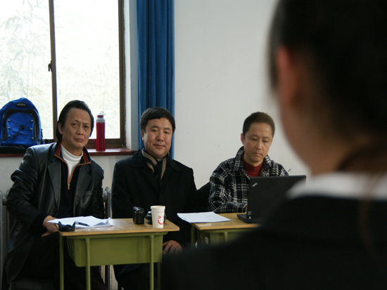上午8:30各专业考场开始考试,面试的主考老师们聚精会神地考察着每位考生的临场表现,并进行书面记录,同时摄像机实录着考试的全过程,认真地物色优秀苗子,考试每个单元一结束,老师们都及时汇总交流。戏文编导类的教师们都集中在会议室细致地阅卷,今年写作科目试行统一命题,统一阅卷的办法。这种办法,使考生避免了重复考试,节省了时间与化费。