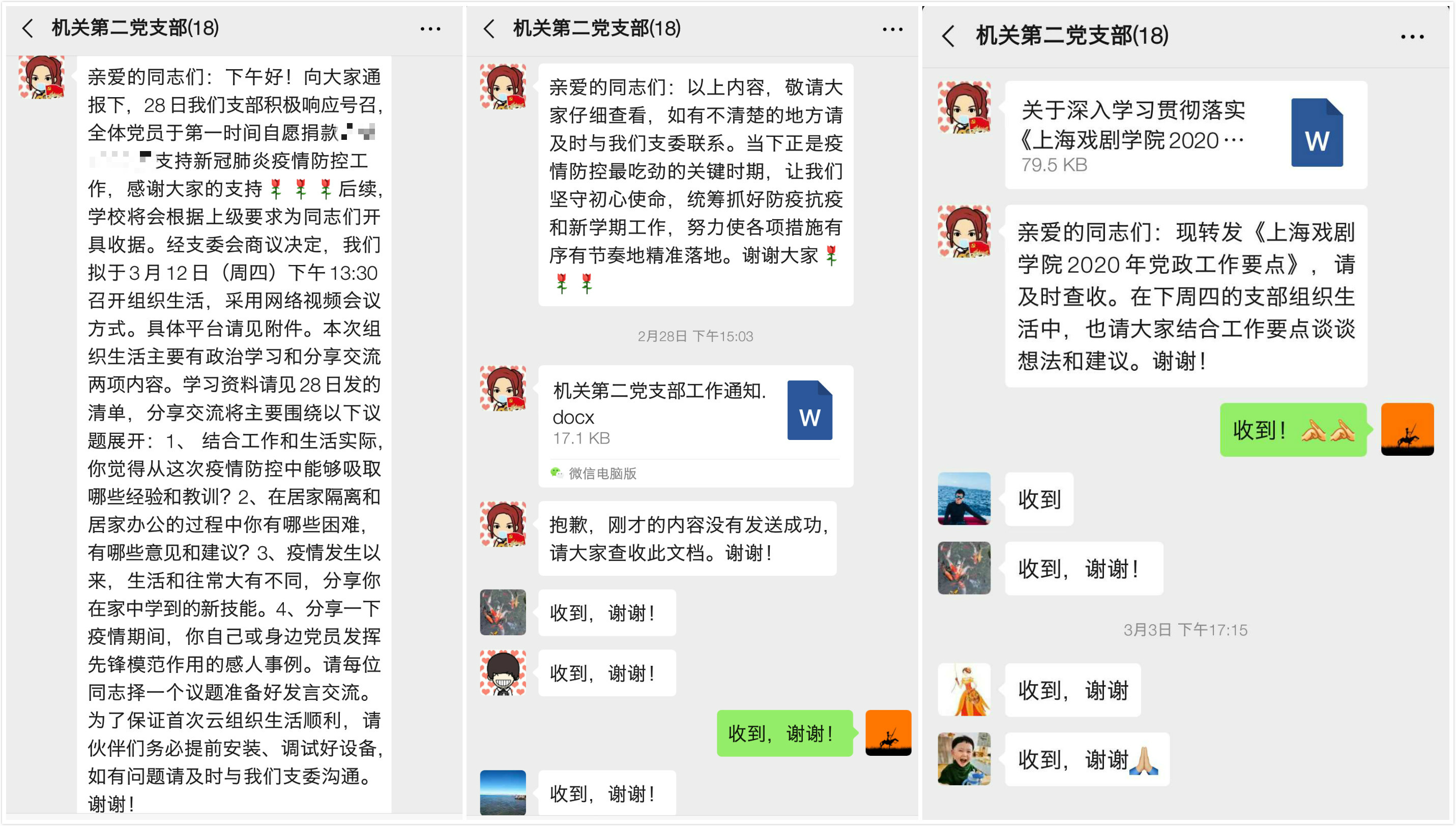 会上,党支部副书记王芳同志带领全体党员学习了习近平总书记近期关于疫情防控工作的重要讲话精神,徐莹同志向大家传达了《关于深入学习贯彻<上海戏剧学院2020年党政工作要点>的通知》精神,要求各位党员同志能够严格对标对表,把本职工作和支部工作与要点内容紧密结合,不断提升工作干劲和履职能力。接下来,支部党员逐一就疫情防控相关议题展开交流研讨,畅谈心得体会。