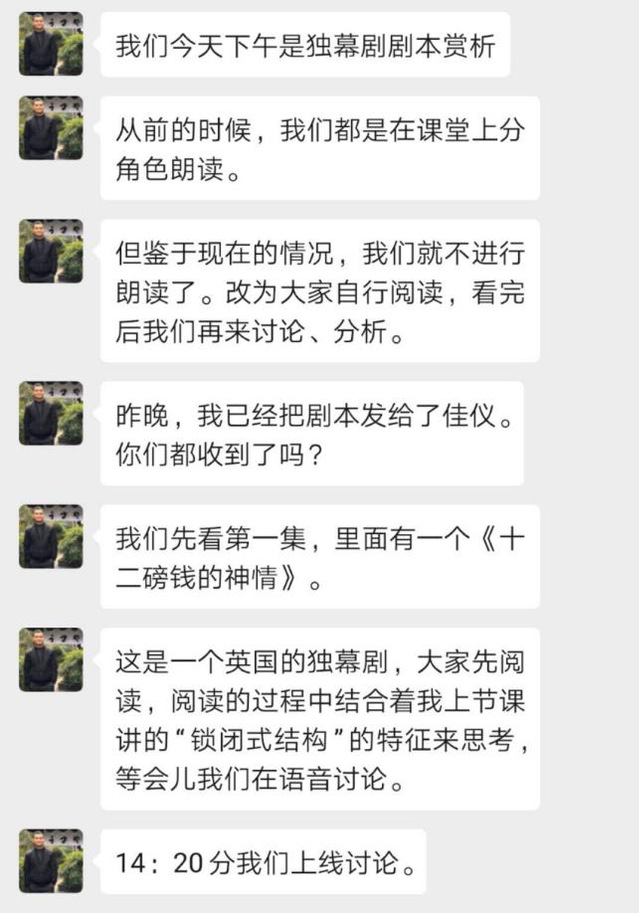 在李世涛老师的《独幕剧写作》小组课上,我们利用腾讯会议、超星学习通等软件支撑起了线上课堂。同学们首先通过老师共享屏幕以及分享教学资料进行堂课学习,了解基本的独幕剧概念、结构等理论知识。而后适当改变以往的形式,经过自行阅读独幕剧剧本后,利用视频软件,结合课上所学进行线上讨论。同时,剧本构思、剧本修改等环节也可以运用语音聊天的形式,老师对同学们的作品提出精准的指导意见,我们也在此过程中不断提高写作水平,受益良多。