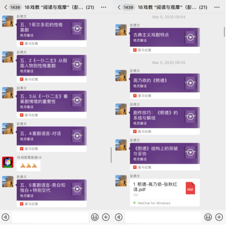 (同学们参与录制的《熙德》剧本线上朗读有声书微信群分享截图)
