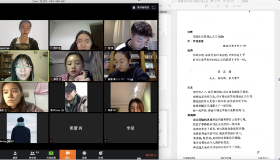 在班主任彭勇文老师教授的《阅读与观摩》课上,我们使用了Zoom和钉钉等线上视频会议工具,实现了与线下一样的面对面互动讨论。同时,彭老师组织了部分同学参与谭霈生教授《世界名剧欣赏》的有声书朗读,与当下阅读的剧本进度相结合,运用多种方式促进学习,加深同学们的认识与记忆。此外,彭老师还开展了别开生面的线上剧本朗读会;同学们两两为一组,选取剧本《熙德》中的片段,通过视频来对戏。虽然我们不能在教室里相聚,但同学们对于剧本讨论的热情不减,互联网技术增添了更多丰富的形式,让课堂迸发了思想交锋的火花。
