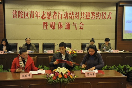 2月25日下午,普陀区青年志愿者行动结对共建签约仪式暨媒体通气会在普陀区人民政府举行,校团委副书记徐晶、上戏文化志愿者服务队代表顾与非出席仪式。上戏与普陀区团委签约,结对共建普陀区青年志愿者服务中心金晶分中心。