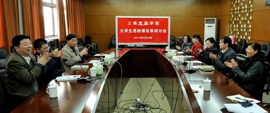 社科部施华东老师对我校下一步思政课改革的思路和方法作了汇报。如:大幅度减少授课时间,将教材分为五个专题,五次课理论讲完基本内容;然后发动大学生以课题组形式组成若干个学习小组,以电视专题片拍摄制作等载体完成思政课的学习任务。