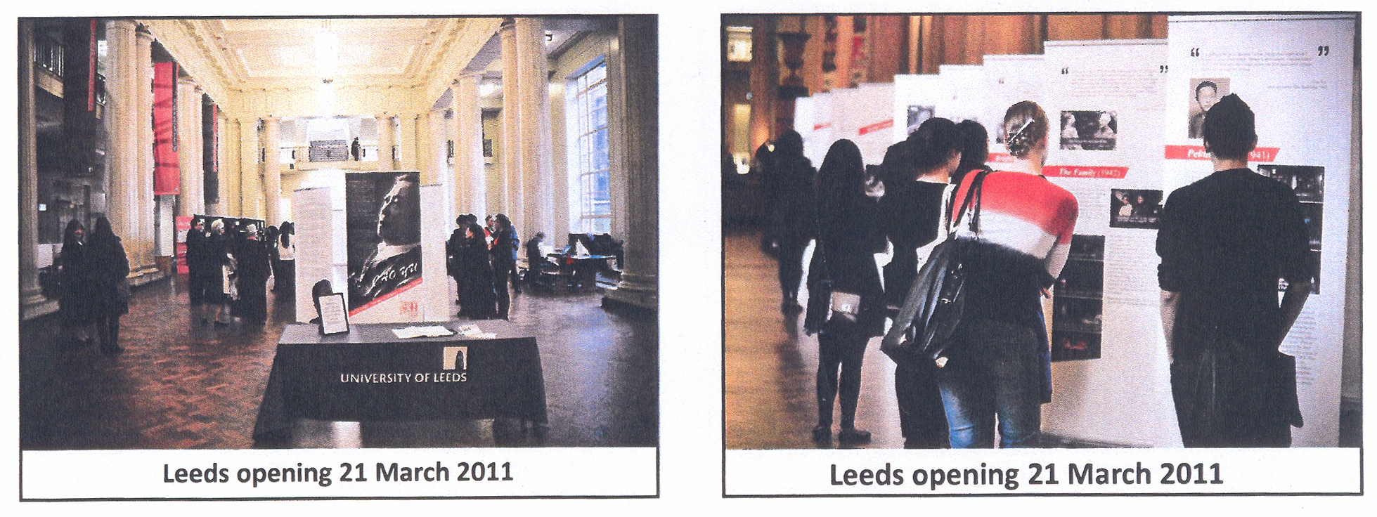 2011年2月10日,由我院戏剧博物馆与英国白玫瑰东亚研究中心/利兹大学东亚系、北京人民艺术剧院戏剧博物馆等合作主办的“曹禺:中国现代戏剧的先锋”——纪念曹禺诞辰100周年摄影展览在伦敦亚非学院开幕。中国驻英国使馆公使衔文化参赞吴逊、孔子学院院长张新生、利兹大学李如茹教授、尤德爵士夫人(Lady Youde),以及来自英国文化协会、大英博物馆、大英图书馆等文化界的百余位重要嘉宾出席。随后,展览和“曹禺生活与作品”的演讲、戏剧演出《太阳不是我们的》系列活动于3月21日在利兹继续进行。吴逊公参、曼城中国领事馆总领事倪坚、教育领事傅恒升专程前往利兹参加此次展览、演出活动。倪总领事在讲话中表示,他很高兴,中国现代戏剧能够使英国普通民众感兴趣。利兹大学副校长Richard Williams在展览开幕式上说,利兹大学非常荣幸能够和中国这样一位伟大的戏剧家有如此密切的联系。