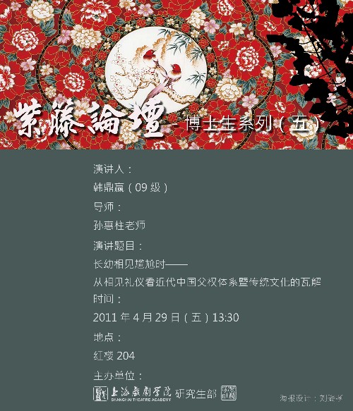 时间:本周五下午1:30 地点:红楼204演讲题目:长幼相见尴尬时 ——从相见礼仪看中国父权体系暨传统文化的瓦解 演讲人:韩鼎赢(09级博士) 导师:孙惠柱主办单位:上海戏剧学院 研究生部 研究生紫藤学社(转自研究生部网页 编辑:榕树)