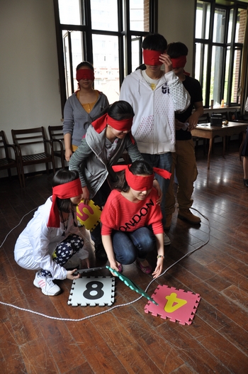 接下来的游戏将同学们分为三个区,分别代表盲人岛、哑巴岛以及珍珠岛(健全岛)。要求同学们在完成各自任务的同时全部以限定方式到达珍珠岛。其间同学们相互信任、共同合作。“盲人”与“哑巴”们通过自己的努力,克服重重困难终于顺利抵达珍珠岛,重获声音与光明。在历时40分钟的游戏后,同学们感想颇多,摸索到游戏的寓意:珍珠岛上的人们代表当今社会的领导高层,而盲人岛与哑人岛则代表中低层社会中那些盲目以及敢怒不敢言的普通大众。有同学抱怨说,“如果健全岛的人一开始就下来帮助和领导他们,那这个游戏时间将减少一半。”但健全岛上的人们虽然积极的规划蓝图、攻解一道没有意义的数学难题,却没有给予其他两个岛的“弱势群体”力所能及的帮助。健全岛的同学终在游戏后幡然醒悟,明白这个游戏的真正含义。
