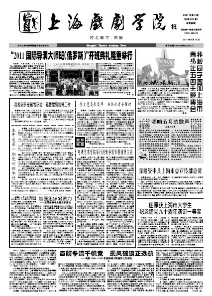 《上海戏剧学院报》2011年第5期(总第222期)已于2011年5月10日出版,本期共四版。重点内容有:《2011国际导演大师班(俄罗斯)”开班典礼隆重举行》、《我校同学参加上海市青少年五四主题集会》、《我校受中共上海市委宣传部嘉奖》、《我校召开支部书记会 部署党员教育工作》、《本年度第一期党训班举行》等,敬请关注。也可点击下载观看。(图文、编辑/榕树)