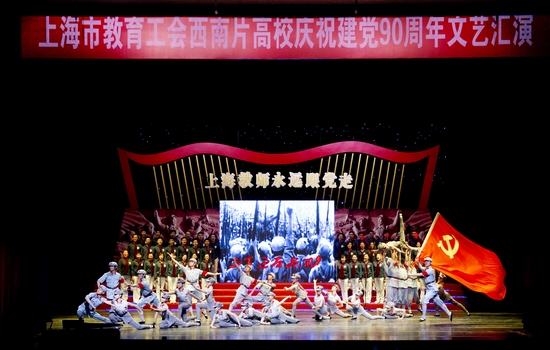 5月17日下午,在唢呐鼓乐齐鸣声中,“上海教师永远跟党走”上海市教育工会西南片高校庆祝建党90周年文艺汇演在上戏剧院开场了。此次文艺汇演由我校承办,上海市教育工会西南片高校和部分民办高校等21个单位参加。上海市教育工会副主席张中韧、上海戏剧学院党委书记楼巍、上海戏剧学院工会主席葛朗出席了文艺汇演。