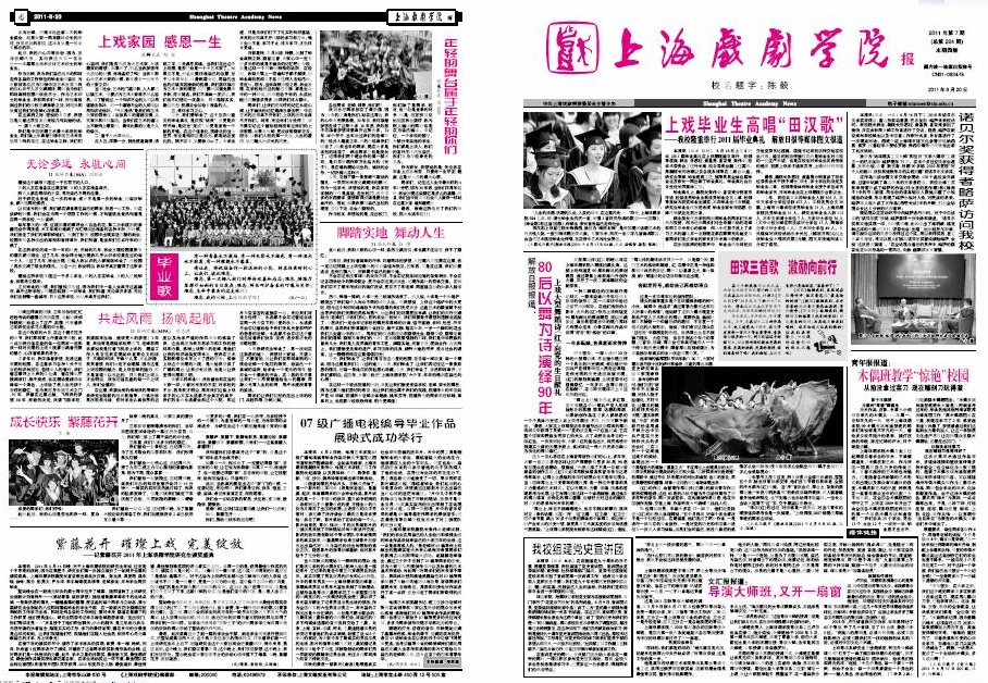 《上海戏剧学院报》2011年第7期(总第224期)已于2011年6月20日出版,本期共四版,第一、四版套红。重点内容有:《上戏毕业生高唱“田汉歌”——我校隆重举行2011届毕业典礼 解放日报等媒体图文报道》、《诺贝尔奖获得者略萨访问我校》、《我校组建党史宣讲团》等,敬请关注。也可点击下载观看。(图文、编辑/榕树)