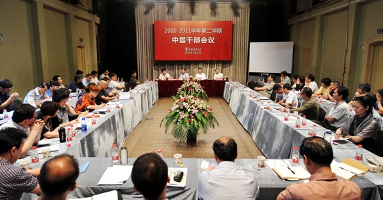 7月11日、14日,我校在华山路校区新空间召开2010-2011学年第二学期中层干部会议。党委书记楼巍主持会议并作讲话。校领导韩生、孙惠柱、黄昌勇、宫宝荣、张伟令出席大会并在主席台就座,全体党政中层干部参加了会议。