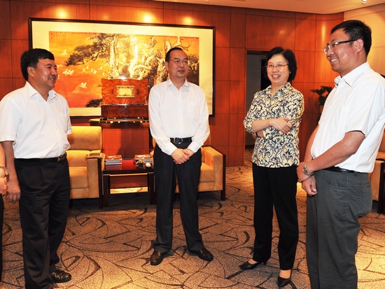 图为殷一璀副书记与杨振武部长祝贺首演成功