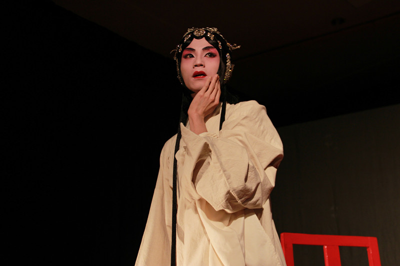 这部《聊斋》之所以会被我称道,是因为导演是一位懂戏曲的戏曲演员,而导演找的演员们都是一些从事国学的人——评书演唱家、古琴家等,他们的确可能在表演的规律上懂的不如我们学校的表演系学生多,但是他们自身拥有的国学内涵是和中国戏曲相连的。导演在用这些业余演员时就完全从他们个人的特色出发,弹琴的继续在舞台上边弹琴边演戏,说书的就是边说书边演戏。戏曲的程式并不是戏曲的精髓,戏曲的精髓是对中国传统文化的表达。而在《聊斋》中,这种表达被化为了导演对于演员舞台表达的idea,最简单的舞台布景、最诗化的台词等。是如春风化雨化到戏的每一寸每一里。把戏曲文化“渗透”,才是在当今社会戏曲创新里需要的。但反观之同样在创想周中以戏曲创新为目的演出的《融》,把戏曲沦为伴唱,低俗不堪,用乾旦艺术来满足低品位观众的审美情趣,随便唱几句杨贵妃虞姬的唱段就以为自己戏曲得不行,实在让人忍不住嗤之以鼻。
