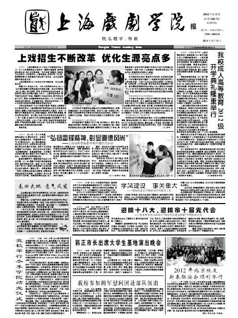 《上海戏剧学院报》2012年第2期(总第232期)已于2012年3月10日出版,本期共四版,重点内容有:《上戏招生不断改革 优化生源亮点多》、《我校成人高等教育2012级开学典礼隆重举行》、《“弘扬雷锋精神,彰显道德风尚”——上海戏剧学院新学期升旗仪式启动》、《学风建设 事关重大——我校党委会专题研究学风建设工作》等,敬请关注。也可点击下载观看。(图文、编辑:榕树)