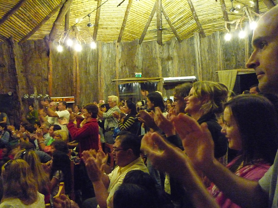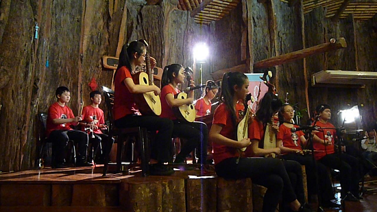 在经历了三十几个小时的长途飞行后,上戏民乐代表团终于顺利抵达目的地——伊瓜苏。阿根廷时间五月二十一日下午,乐团随即参加了闭幕式大合奏的排练。晚上7点半,在伊瓜苏著名的Aripuca剧场,上戏民乐代表团向当地观众献演了《男儿当自强》、《洪湖水》、《少林寺》、《映山红》、《好汉歌》等多首中国经典电影音乐作品,这些作品时而清新悠扬、时而铿锵有力,情韵连绵,委婉动听,受到当地观众的热烈欢迎和热情追捧。尽管演出谢幕了三次,又加演了两首曲目,剧场内外的观众仍然挤得水泄不通,掌声不断,久久不愿离去。每个人的脸上洋溢着对中国民乐和小演员们精彩演出的赞叹和佩服之情。有些热情的观众甚至直接冲到后台堵截中方小演员。用拥抱和不熟练的英语感叹演出的精彩,并要求留影、索取签名。一位去年曾观看过上戏民乐代表团演出的小观众,在母亲的陪同下找到扬琴演奏小演员朱勤静,小观众面对喜欢的“偶像”,又是羞涩又是激动,那股儿喜悦地无以言表的神情,深刻地让在场的每一位感受到“音乐无国界”的无穷魅力。一位长者在看完我们的演出后,直接来到后台要求见见他心中最最喜欢的“小胖子”鲁杰同学,当面表达对他演出的赞叹之情。一时间后台人头攒动,热闹非凡。与我们同坐一部车返回宾馆的特立尼达和多巴哥共和国代表团在我们上车之际,爆发出经久不息的欢呼声和鼓掌庆祝我们演出成功,中方小演员们也回以欢呼表示感谢,文化的交流在瞬间拉近了彼此的距离。