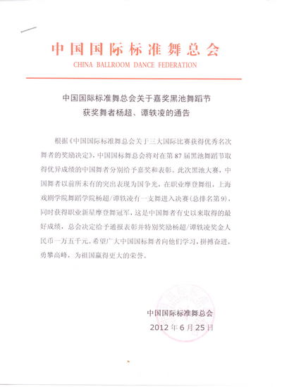 我校舞蹈学院05级国标舞专业学生杨超、谭轶凌前不久参加在英国举行的第87届黑池舞蹈节大赛中取得了优异的成绩,获得职业新星摩登舞冠军,这是中国舞者有史以来取得的最好成绩。鉴于杨超、谭轶凌的突出表现,中国国际标准舞总会颁布嘉奖通告,对杨超、谭轶凌给予嘉奖和表彰。(文、图:舞蹈学院 编辑:榕树)
