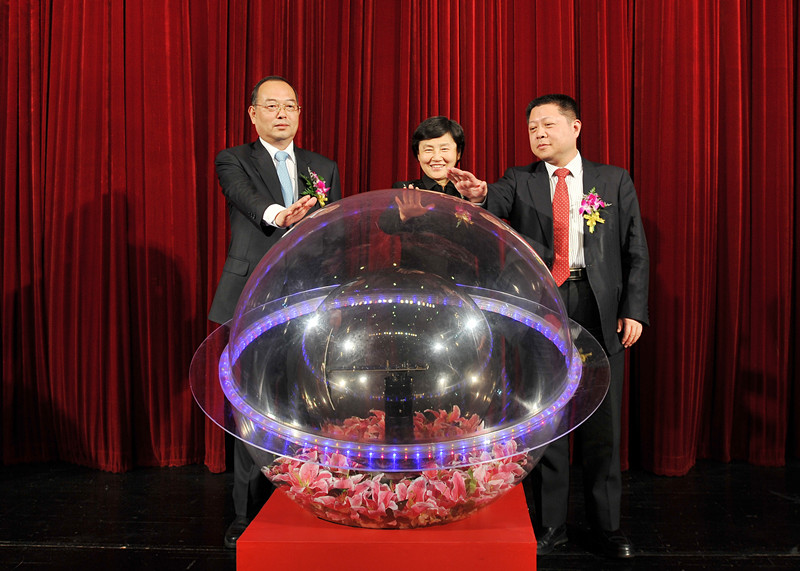 图为王仲伟、杨振武、杨承志共同启动水晶球,宣布校园戏剧节开幕