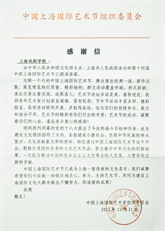 近日,中国上海国际艺术节组织委员会向我校发来感谢信,现刊载全文如下: