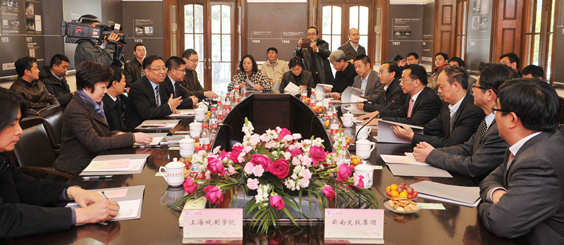尔后,代表团一行来到了佛西楼会议室,楼书记向代表团成员介绍了学校在表演、导演、创作、舞蹈等方面的情况以及学校与国际上合作交流的情况。听完了楼书记的介绍,高峰副省长感慨地说:“上戏的知名度、美誉度早就听说,此次亲临上戏,耳目一新,不虚此行!”高副省长还表示,上戏在人才培养方面的经验,值得云南学习。他满腔热情地说,参观了米亚中心和虚拟实验室,他深深感受到了上戏在科技、创意、艺术方面相互结合的魅力。上戏的这些宝贵经验对云南的发展有很好的借鉴意义和推广价值。通过上戏校庆《红楼梦》的全息成像,让他进一步了解了上戏的校风、办学历史和人文风貌,希望今天的合作是个良好的开端。今后,云南将在学科专业建设、文化旅游等方面与上戏开展全方位的合作,真诚感谢并欢迎上戏人才去云南指导。