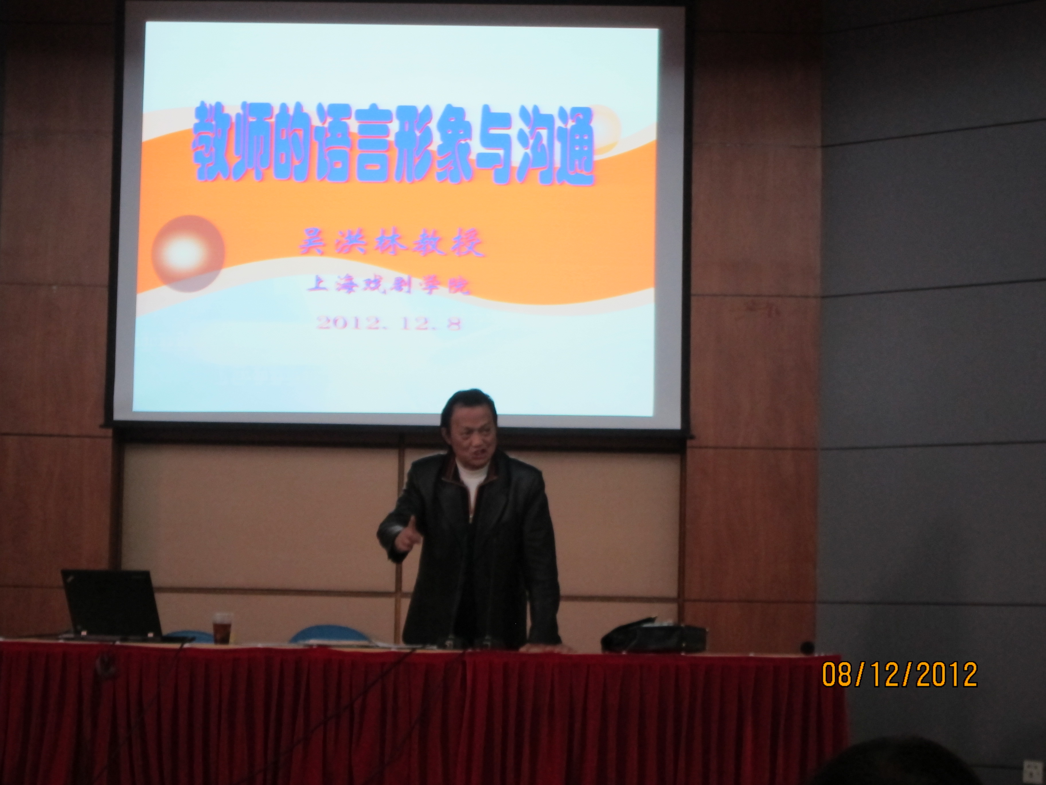 上周六(12月8日),应著名教育家、杨浦高级中学名誉校长、上海市特级教师、上海市中小学优秀校长于漪女士的邀请,上海戏剧学院主持与口语传播工作室教授、主持艺术硕士生导师吴洪林教授专程前往杨浦高级中学授课讲学,为期半天的讲座围绕着“教师的语言形象与沟通”的主题展开。84岁高龄的于漪老师抱病坚持与“于漪语文基地班”的九十余全市中小学语文教师一起全程聆听曾是董卿硕士生导师的吴洪林教授精彩的演讲。