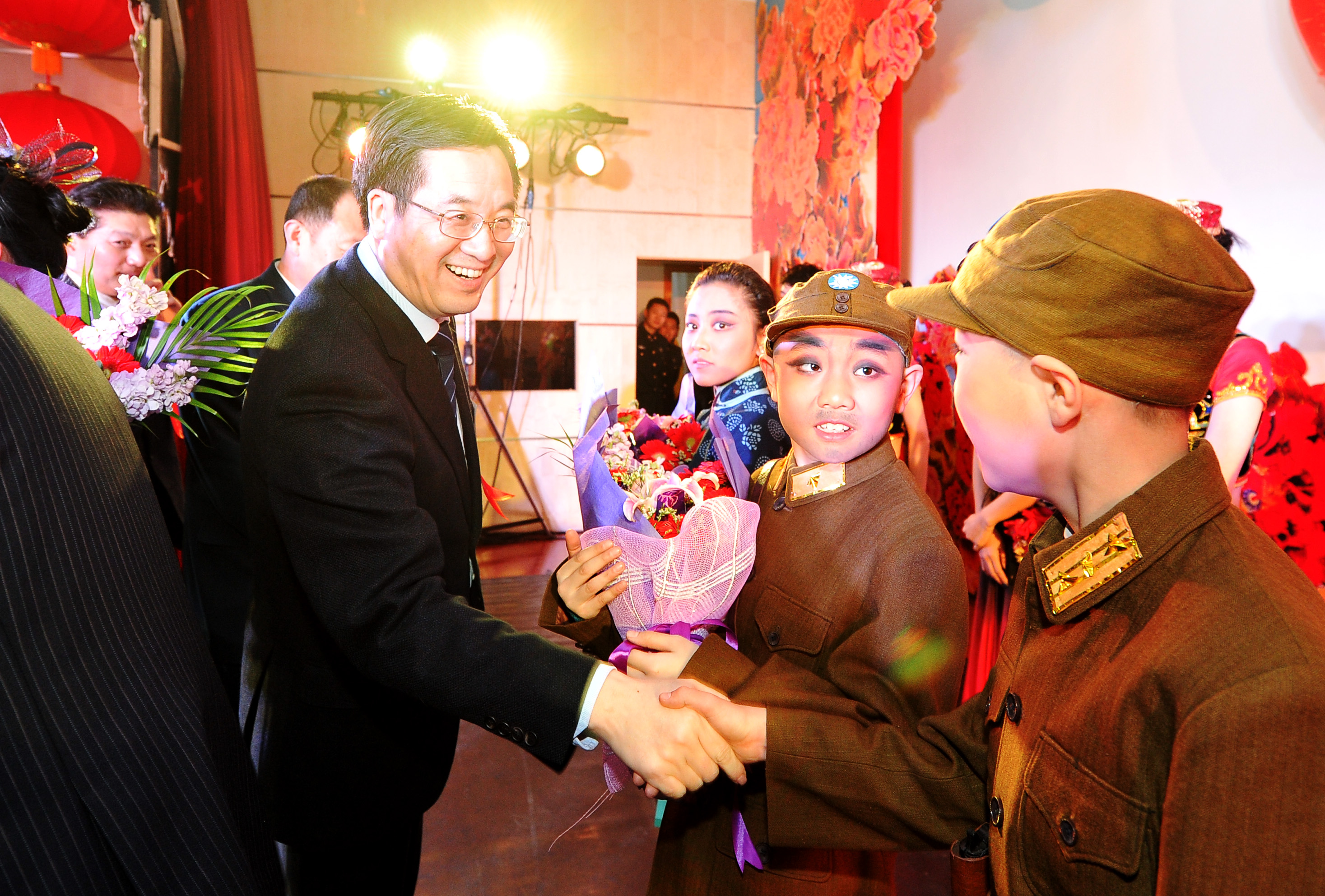 图为丁薛祥亲切与我校演员握手并祝贺演出成功