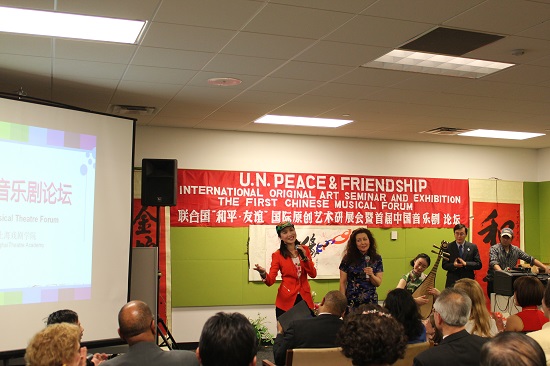 3月21日晚7点,来自美国、中国、葡萄牙、泰国、贝宁、日本等多个国家和地区,从事音乐剧艺术研究的100多名专家学者、表演艺术家、国际知名艺人等,兴致勃勃地来到了曼哈顿1大道45街联合国总部NLB会议E厅参加论坛。参会的还有几国大使及夫人,他们发表了热情洋溢的讲话,并带来了许多原创作品,向此次活动主办方表示热烈祝贺。会议厅正中挂着“联合国‘和平与友谊’国际原创艺术研展会暨首届中国音乐剧论坛”的横幅大标语,座无虚席、气氛热烈。