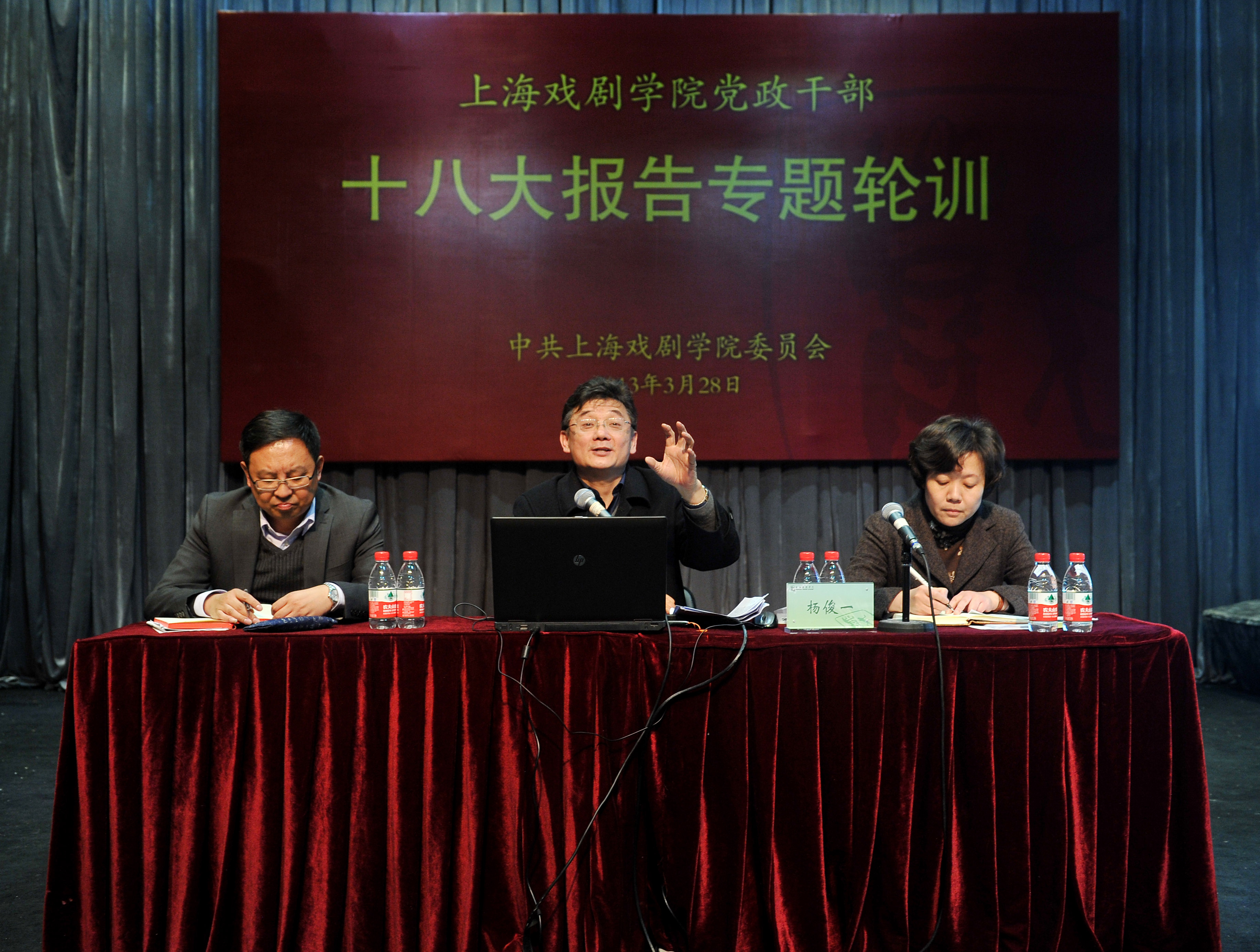 3月28日下午,我校在新空间举办十八大报告专题轮训,邀请上海政法学院党委书记杨俊一做辅导报告。报告会由党委副书记胡敏主持,全体中层干部参加。