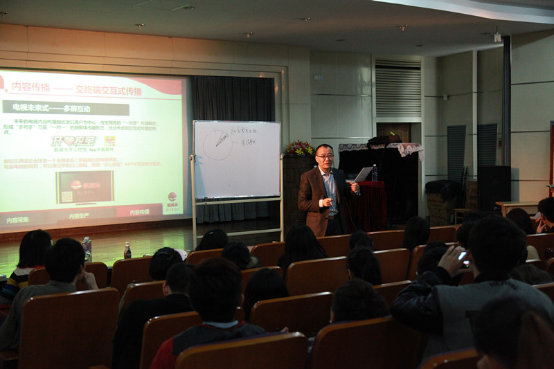 李勇老师一开始就直截了当地指出:传媒行业正在发生重大变化,同学们在课堂里所学习的专业知识很可能将来在岗位上用到得越来越少了。紧接着,他提纲挈领地回顾了新中国成立以来,大陆广电传媒领域主流观念和产业格局的历史变迁,阐明了在数码化实现了平台内容共享的可能性之后,传媒行业的真正拐点——全媒体时代——到来了。这个拐点带来的是一个全新的市场空间。李勇老师举例说,新娱乐传媒对新闻导语作了一些有趣的限制——字数需要限制在140字以内。这样经过审核之后,新闻导语就可以直接发布到新娱乐微博上,利用社交网络进行传播和互动。随后,李勇老师以大众传播和品牌营销的理论为基础,剖析了收视率,核心价值、超前投资对于提升节目质量的重要作用。在讲座过程中,李勇老师引用大量生动事例,讲解风趣幽默,还特别注重与师生互动对话,善于引导同学们积极思考和辩论。