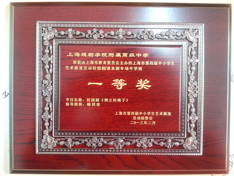 近日,由附中学生自己创编并演出的校园剧《倒立的椅子》荣获了由上海市教育委员会主办的上海市第四届中小学生艺术展演活动校园剧/课本剧专场中学组一等奖。据悉该奖是本次艺术展演活动所设立的最高奖项。