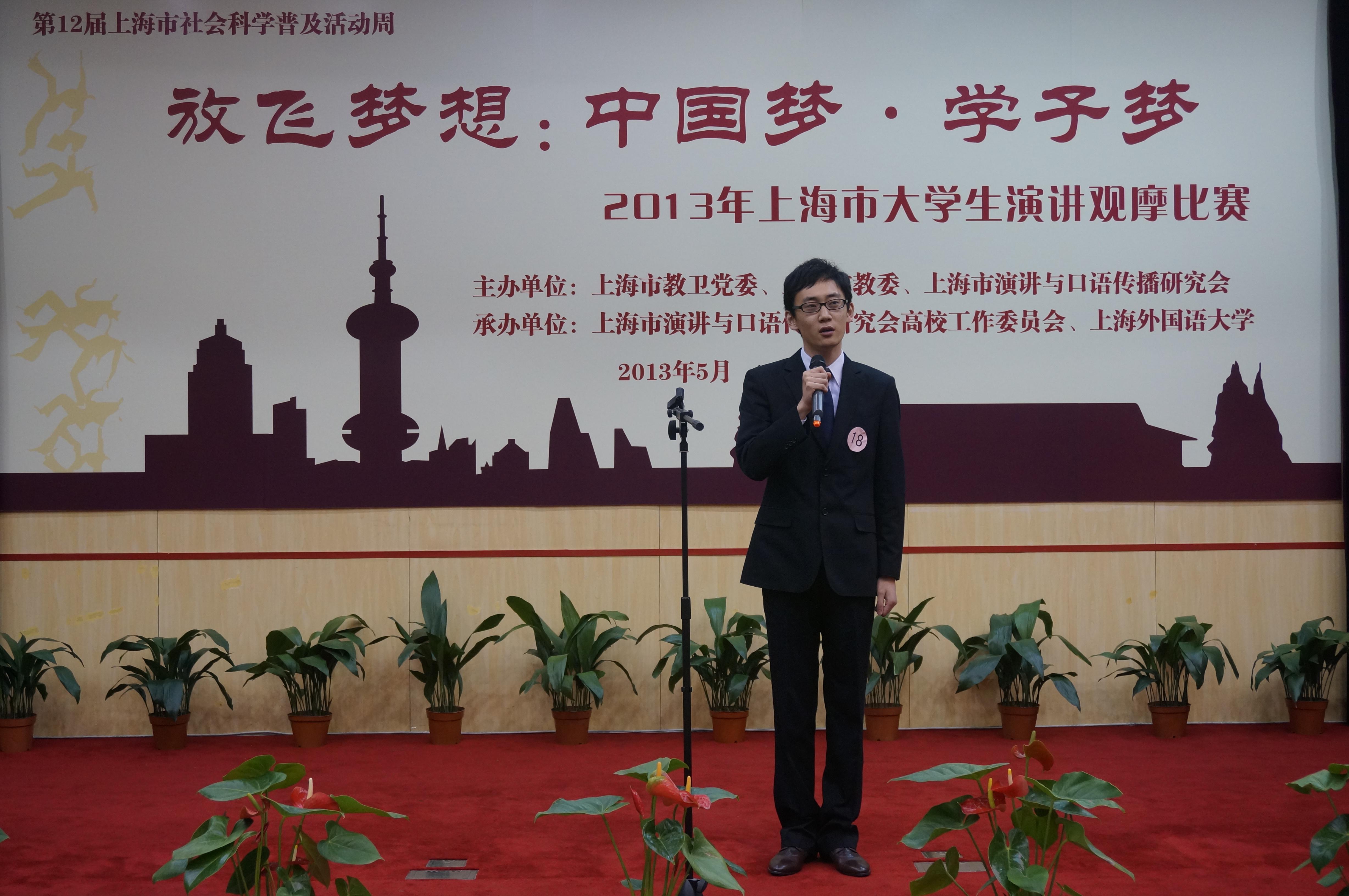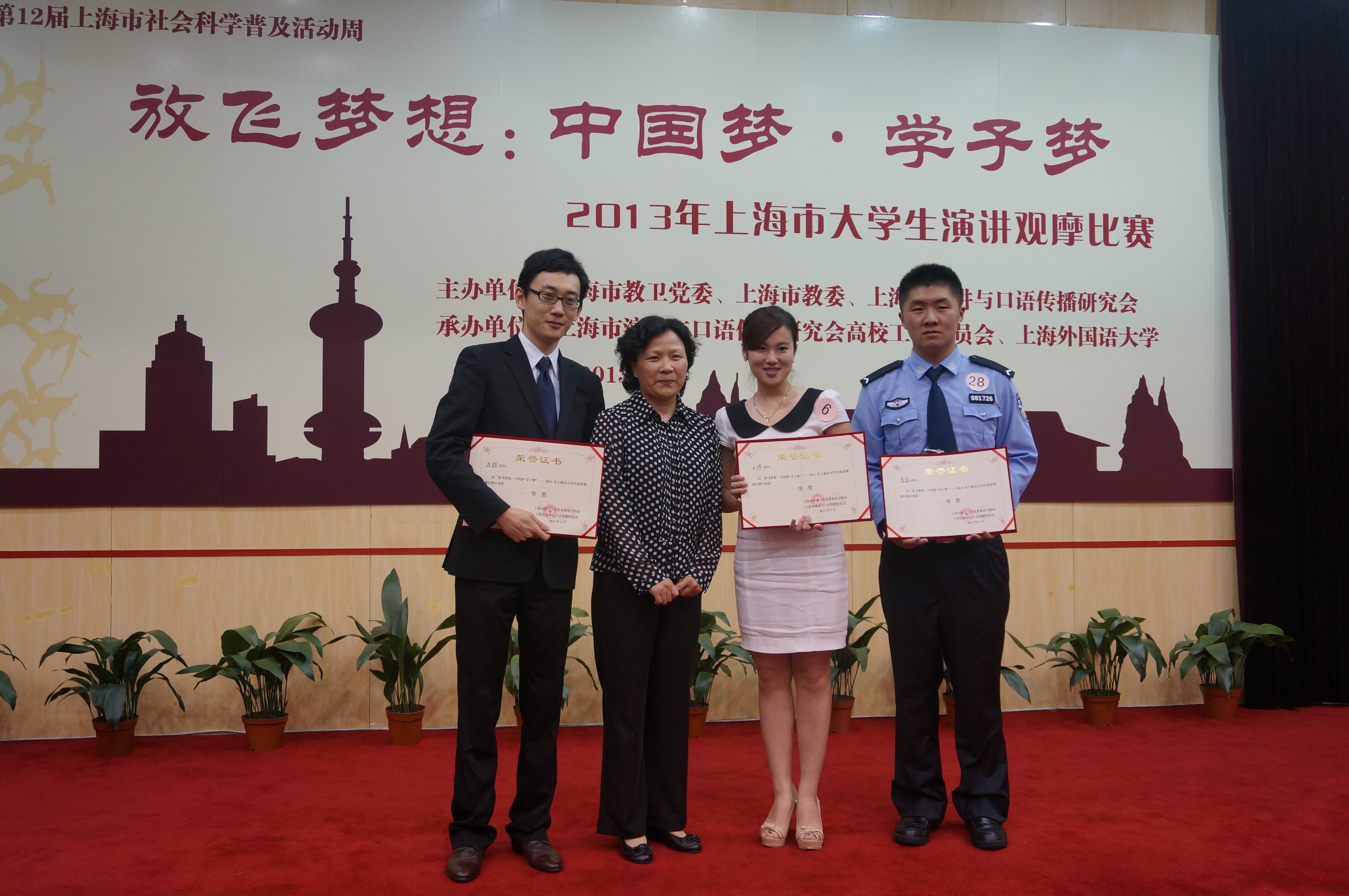 为深入传播“中国梦”的坚定信念,营造“中国梦”的良好氛围,5月27日, “放飞梦想:中国梦•学子梦”上海市大学生演讲比赛在上海外国语大学逸夫楼成功举办。来自全市各高校30名选手参加角逐,我校电影电视学院研究生马聪代表学校参赛,并在比赛中表现出色,获得比赛第一名的好成绩。我校宣传部长张生泉作为评委应邀出席。