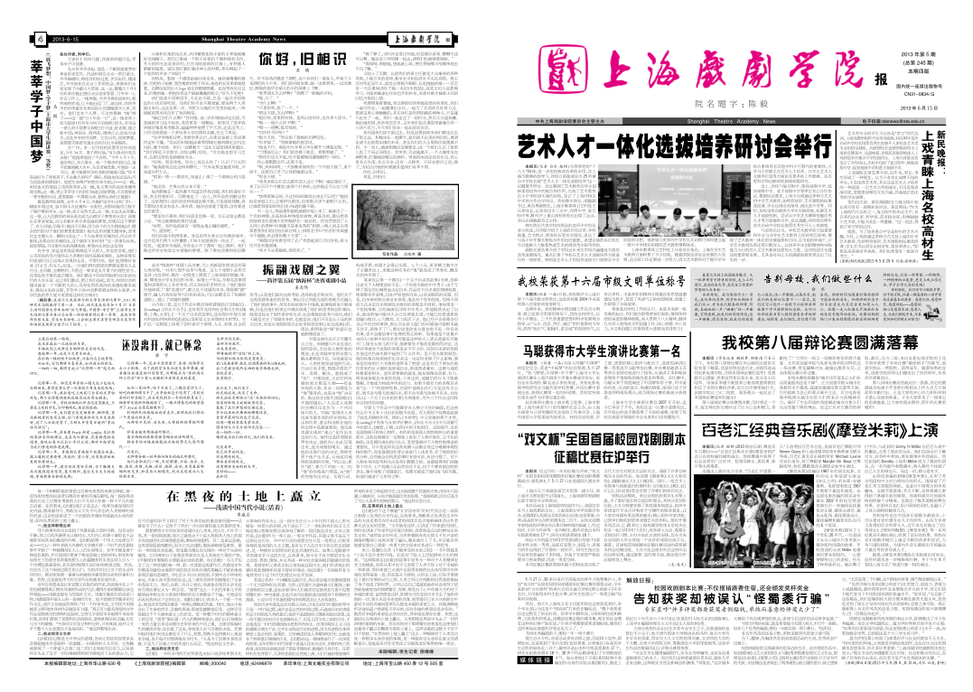 《上海戏剧学院报》2013年第6期(总第248期)已于2013年6月15日出版,本期共四版。重点内容有:《艺术人才一体化选拔培养研讨会举行》、《我校荣获第十六届市级文明单位称号》、《百老汇经典音乐剧<摩登米莉>上演》等,本期第三版还刊登了《第二届“源点杯”小品比赛座谈纪要》,敬请关注,也可点击下载观看。(文、图、编辑:榕树)