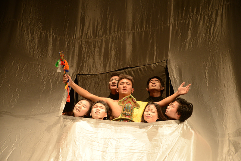 实验剧《根》由白玛次仁编导和导演。这个剧带有民族性的仪式感。沉心静气的淡淡佛香萦绕在观众鼻间。一块宽阔的白布悬吊在舞台上空,橙红色的灯光渲染开来。领舞身穿极富有民族特色的服装,带有图腾的元素。其他舞者身着黑色的服装,腰间系有红色腰带,红与黑形成鲜明对比。音乐渐渐高昂,舞台灯光也伴着节奏逐渐变亮。导演希望在作品《根》中找到传统和现代文化各自平衡的领域。时代的发展导致传统文化和现代文化相互碰撞。两者可以共存的方式是找到彼此存在的矛盾,然后加以解决。作为青年的我们,有责任去重新点燃传统文化的光芒,将其更好地传承下去。