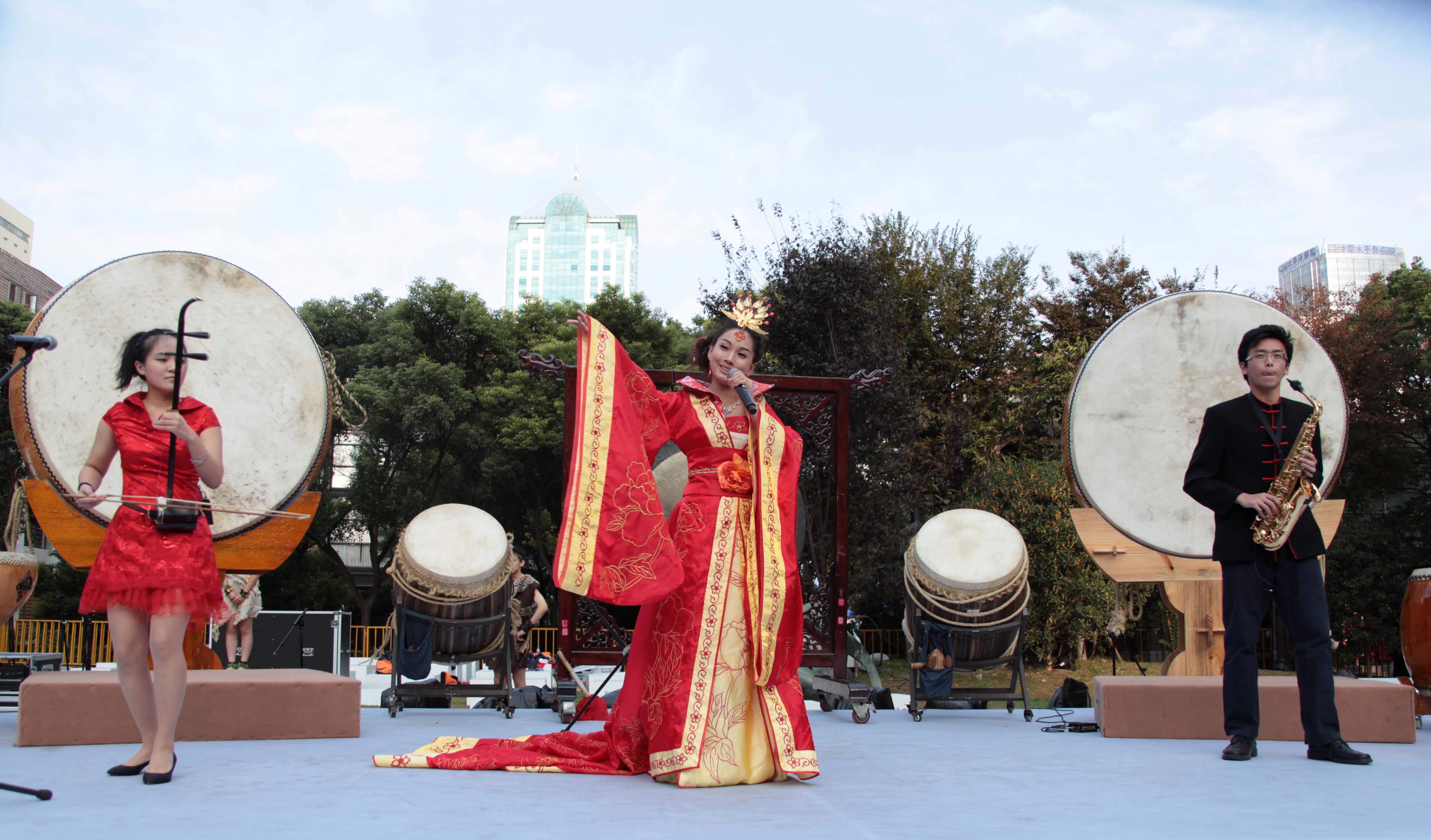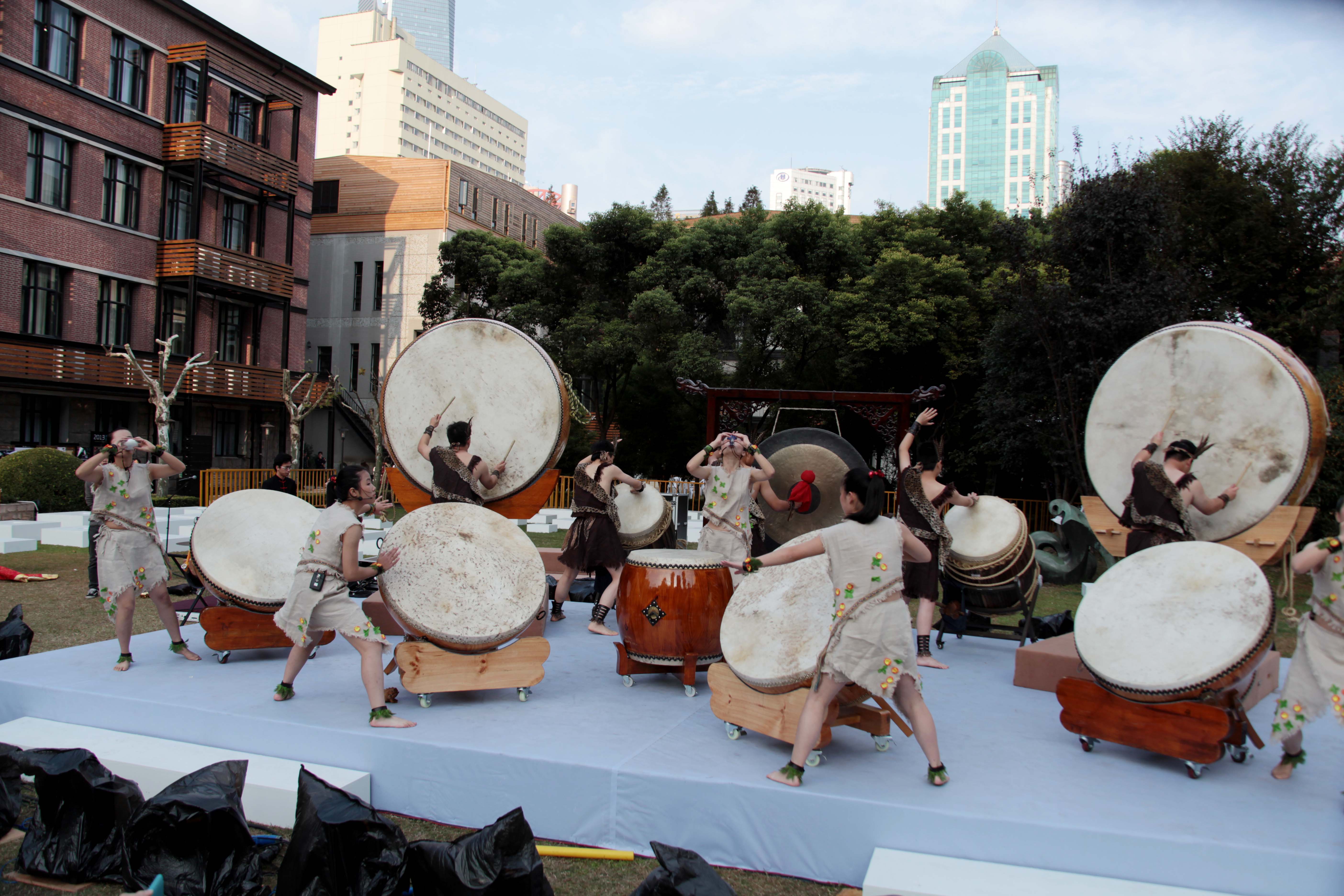 10月24日下午15:00,红楼前大草坪被一群身着红色衣服的少男少女染上了颜色。这就是真如中学鼓乐团的同学们。随着震耳欲聋的鼓声,本次表演的第一个节目《虎跃龙腾》拉开了表演的大幕。随着婉转之上云霄的声音响起,汤康敏出现在舞台中央。这悠扬的声音由一种古老的民族乐器——口弦发出,这种即将失传的乐器放在口腔深处不易看到,让观众们惊奇又兴奋。口弦被誉为“喉咙口的艺术”,因为演奏者在演奏悠扬的乐声时也极易吞下那片小金属,所以演奏极具挑战性。