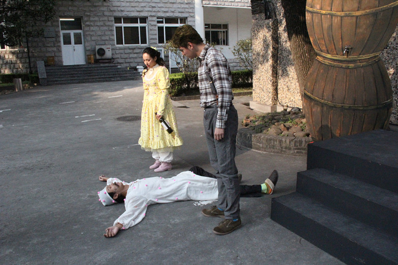 当一个留着两撇胡子、穿着棕褐色高档大衣、踩着锃亮的皮鞋、带着贵族高礼帽的大个子男人出现在上戏校园的一隅,他残酷霸道,爱指着人家鼻子痛骂。你一定会以为穿越到了上世纪剥削阶级的德国,可是这一幕却真真切切地在这里上演了。堆砌的巨大伏特加酒桶,名贵的老爷座椅,姹紫嫣红的花园,盛满佳酿的手推车,貌美似公主的女儿,衣服破烂、处处受气的穷小子,行云流水般的现场小提琴演奏。典型小资阶级的布景在这里精致地打造出来,也是表演系释放天性、大显身手的舞台。路边的创新位置设计,引人注目,大批的人群都在倾听着,观察者,体味着这穿越时空而来的爱恨纠葛。