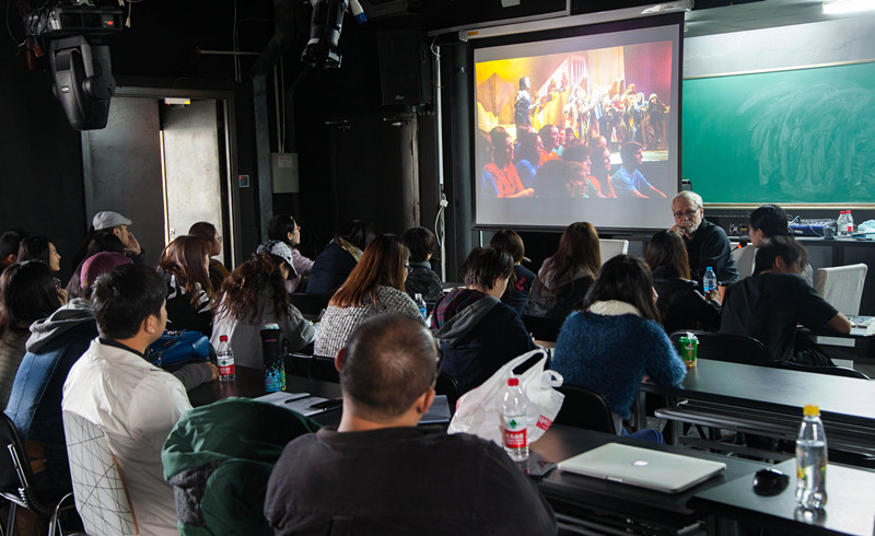 第二天早上,Michael Ramsaur教授对各个组的灯光设计进行了交流讨论,Michael Ramsaur教授在点评前,都会先聆听同学们的建议,引导同学对他人作品进行分析,从中找出其优点和缺点,再让设计组阐述自己的设计理念并与教授进行交流。在这样的一个过程中,同学们的设计能力和表达能力都得到了提升,打破了中国课堂上普遍的被动教学的模式。同学们在别人的设计里发现优缺点,在自己的作品中得到反思。这样的小组训练,锻炼了个人的设计能力也提升了团队协作意识。在下午的美国音乐剧灯光设计课程里,Michael Ramsaur教授通过展示图片资料、视频影像,讲授了音乐剧灯光设计的独特性,分享了个人经验和设计技巧。