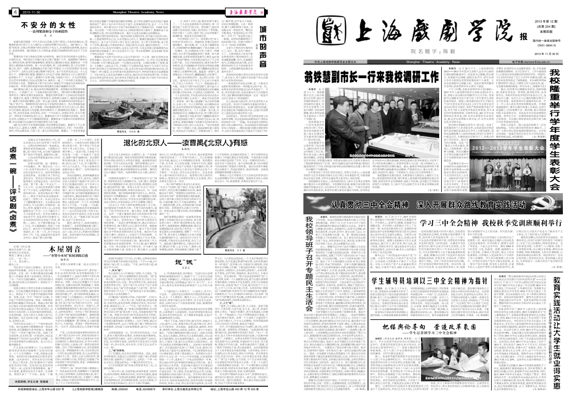《上海戏剧学院报》2013年第12期(总第254期)已于2013年11月30日出版,本期共四版。重点内容有:《翁铁慧副市长一行来我校调研工作》、《我校隆重举行学年度学生表彰大会》、《我校领导班子召开专题民主生活会》、《学习三中全会精神 我校秋季党训班顺利举行》等。敬请关注,也可点击下载阅读。(文、图、编辑:榕树)