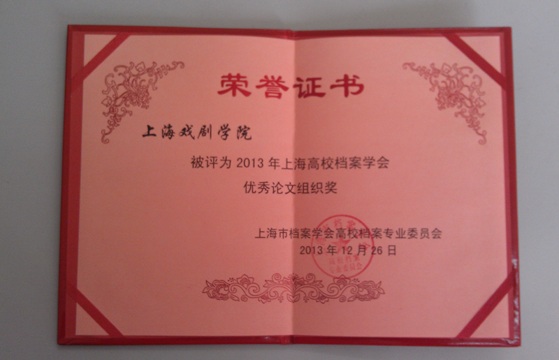 2013年12月26日下午,上海市档案学会高校档案专业委员会第十五次会员代表大会在同济大学逸夫楼召开,来自52所高校的130多名会员代表参加了会议,市教委办公室副主任许波莅临会议并讲话。会上宣布了在2013年学会优秀论文评选中获得优秀论文奖和优秀论文评选组织奖的名单,上海戏剧学院档案室李莉同志的论文《发掘档案深层价值,推进档案编研工作》被评为三等奖,上海戏剧学院被评为优秀论文组织奖。(文、图:档案室 编辑:榕树) 图为荣誉证书