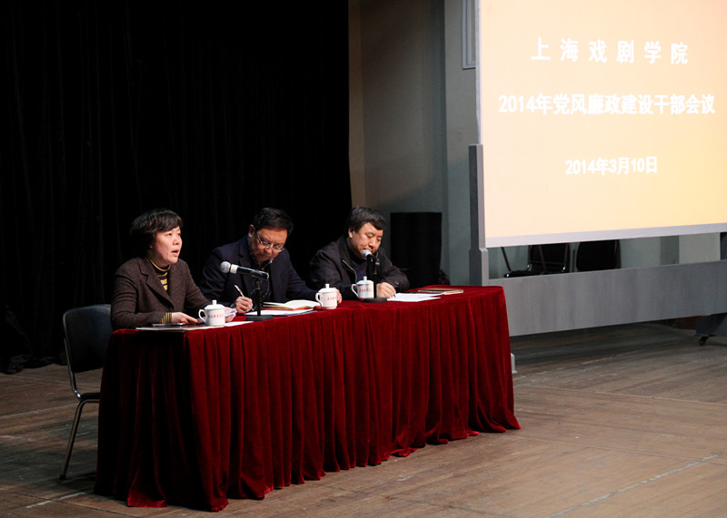 为积极贯彻和落实党的十八大和十八届中央纪委三次全会精神,根据中央、教育部和上海市委、上海市教卫党委的部署和工作要求,以及当前高校反腐倡廉的新形势,2014年3月10日下午,我校在新空间召开党风廉政建设干部大会。党委书记楼巍、副书记胡敏到会并做重要讲话。会议由院长韩生主持,全体中层干部出席会议。