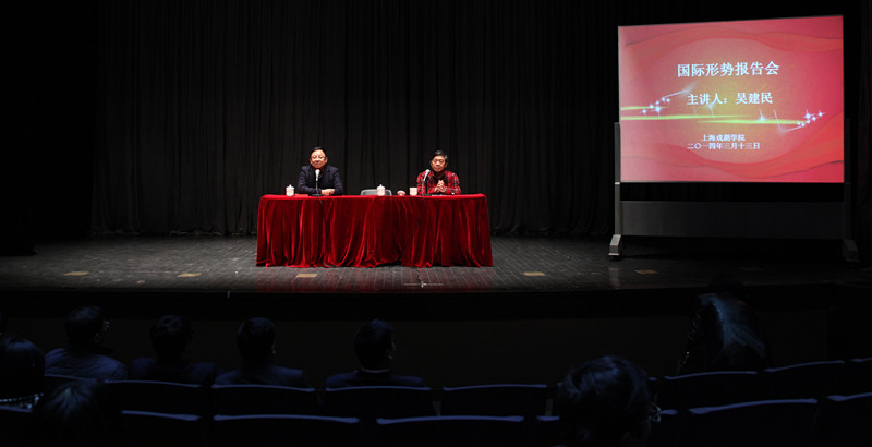 3月13日下午,前驻法国大使、前外交学院院长吴建民应邀来我校做国际形势报告会。报告会在端钧剧场举行,由党委书记楼巍主持,党委副书记胡敏以及学校全体中层干部、离退休老同志和教职工代表、学生代表出席。