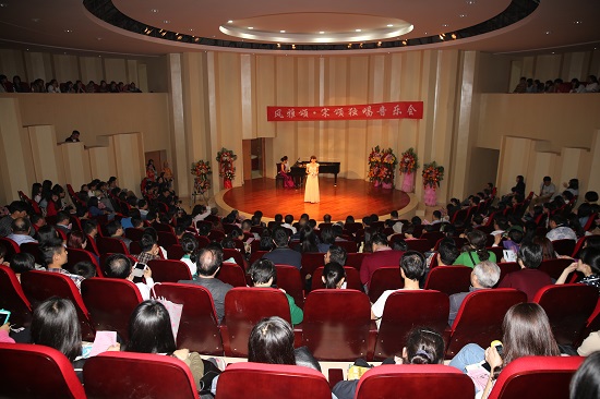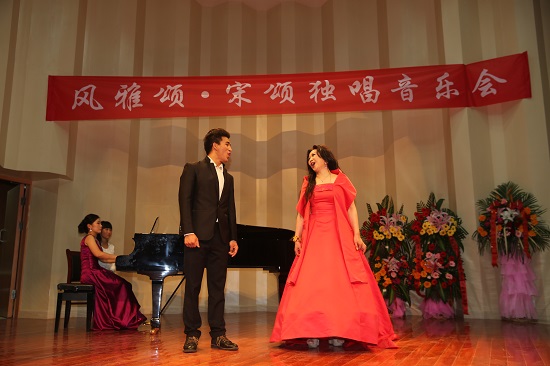 2014年5月19日晚,湖南第一师范学院东方红校区音乐舞蹈学院原声音乐厅座无虚席,我校表演系副教授、青年女高音歌唱家宋颂,成功举办家乡首场“风雅颂”——宋颂独唱音乐会。湖南省教育厅副厅长申纪云、副巡视员徐伟,湖南第一师范学院党委书记彭小奇、校长肖湘愚、纪委书记阳柏苏、副校长刘志敏、副校长童小娇及其他有关方面领导、嘉宾出席了音乐会。音乐会上,宋颂用七国语言向观众演绎了多首中外艺术歌曲、民歌、歌剧咏叹调、音乐剧等曲目。精彩的演唱、巧妙地歌曲编排让观众如醉如痴。整场音乐会曲目丰富,难度大,专业性强。宋颂宛转悠扬的歌声,恰到好处的表演为观众们呈献了一场绝妙的视听盛宴。湖南第一师范学院声乐教师徐彪、宋颂的学生10音乐剧表演班乃保土呷友情出演,把晚会气氛一次次推向高潮。