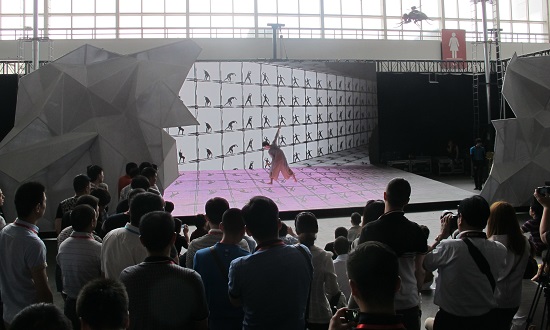 上戏虚拟实验室此次赴京参展的作品,有新媒体舞蹈诗《文明图腾》、《四季》、《极境》,新媒体音乐剧《弘一法师》,新媒体话剧《爱情书简》,新媒体诗剧《追梦中国》,建筑灯光投影《乐舞百戏》等,皆为实验室艺术性、实验性较强的代表性作品。为了充分显示新媒体演艺的艺术形式和独特魅力,虚拟实验室的各个展台均采用了模型与新媒体投影相结合的方式,同时配以精心剪辑的演出音视频,以动与静的有机交融为观众营造了身临其境的艺术体验。此外,由上戏舞蹈学院学生表演的新媒体舞蹈诗《文明图腾》和《极境》片段,每天还在现场进行三场展示,吸引了大量观众前来观看,并从中进一步了解了演员肢体与新媒体语汇如何实现交互。上戏虚拟实验室作品富有冲击力的全方位、立体式呈现,使其在2014中国舞美创意show中备受瞩目。
