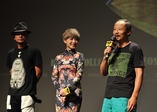 图为微电影《风回路》主创万茜、周野芒、沈涌登台亮相