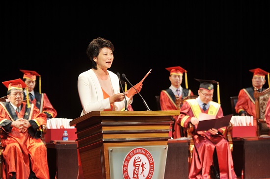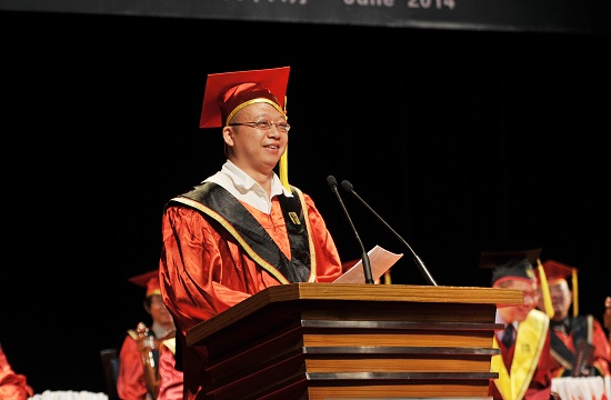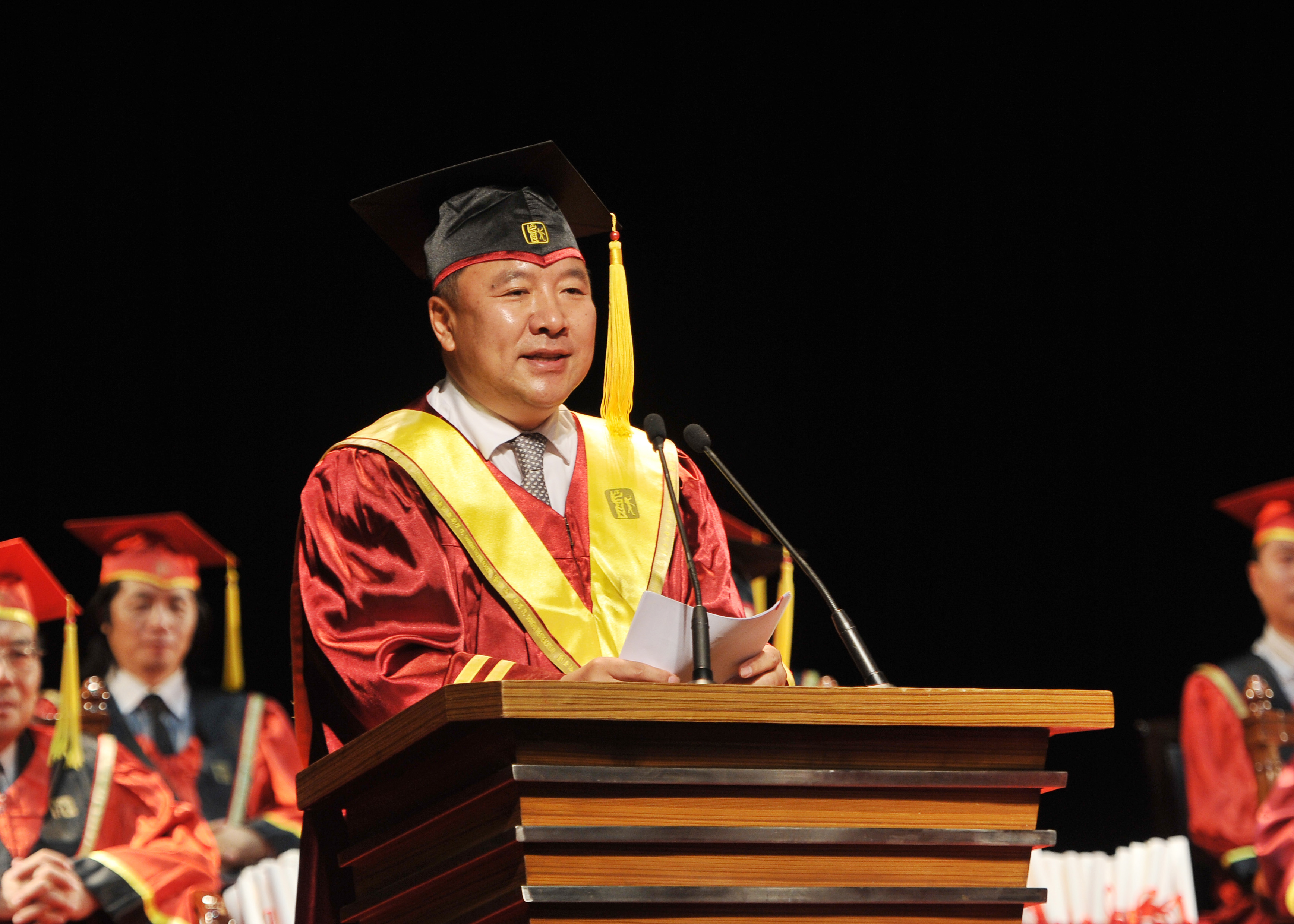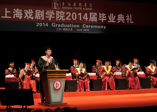 韩生院长在热烈的掌声中代表学校讲话。他首先介绍了2014届毕业生取得的骄人成绩。他说,社会已经不再把大学生视为精英,但社会还需要精英的引领,上戏一开始就是精英教育,对中国戏剧影视等演艺事业发挥着引领作用。希望同学们以实现自己的艺术抱负为价值选择;要勇于表达,担当道义和责任;要以足够的耐心对艺术精益求精;要保持平和的身心;要坚守上戏的社会主义核心价值观,让自己成为一个身心合一、敢作敢为、热爱艺术、热爱生活的上戏人。