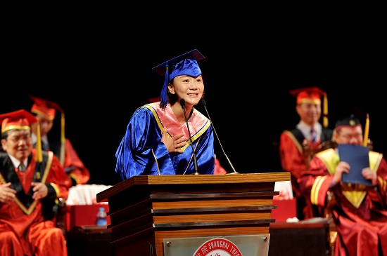 研究生代表王一楠在发言中强调,要用上戏人在工作中团结一致、相互扶助的家园精神贯穿我们的一生实践。她的讲话热情而激动,并不时地与台下每一个院系的同学亲切交流、及时互动,使得毕业典礼的气氛更加活跃。